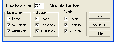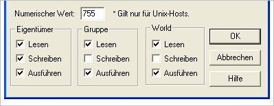 Im folgenden Dialog können Sie die Dateiberechtigungen verändern. Sie können dazu die Berechtigungen entweder einzeln anklicken oder den numerischen Wert direkt eingeben. Eine übliche Berechtigung für Verzeichnisse ist der Wert 755, für einzelne Dateien verwenden Sie bitte 644. Mit dieser Berechtigung hat der Dateibesitzer die Rechte zum Lesen, Schreiben und Ausführen. Andere Nutzer haben nur das Recht zum Lesen und Ausführen der Datei. Nach der Angabe der gewünschten Berechtigung klicken Sie zum Speichern bitte auf die Schaltfläche OK.
