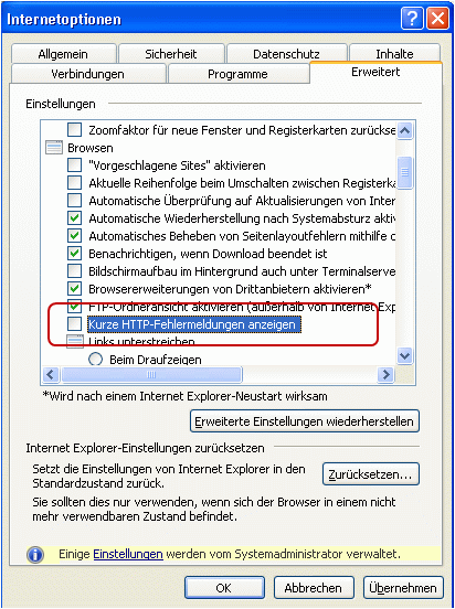 Bitte beachten Sie, dass es beim Internet-Explorer ggf. zu einer falschen Anzeige kommen kann (Ihre eigene Fehlerseite wird nicht angezeigt), da der Browser standardmäßig die Einstellung "Kurze HTTP-Fehlermeldungen anzeigen" aktiviert hat.