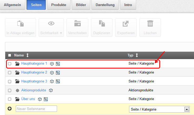 Um eine Unterkategorie im Webshop einzurichten, klicken Sie im Administratorbereich in der Menüleiste auf Inhalte / Kategorien und im Untermenü auf Datenblattansicht. In der Sektion Seiten finden Sie auch die eingerichteten Kategorien vor. Wählen Sie eine Kategorien aus, welche am Typ Seite / Kategorie zu erkennen ist.