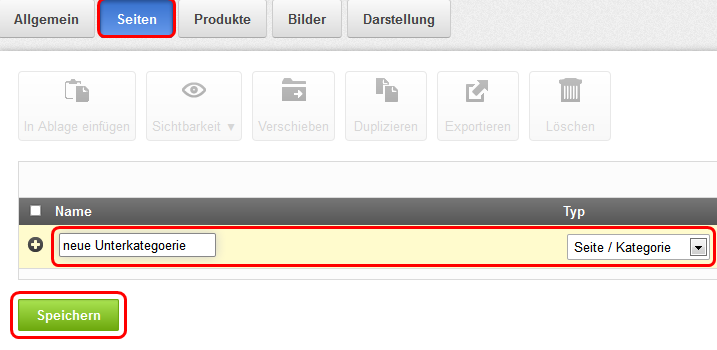 Im nächsten Fenster wechseln auf den Reiter Seiten und vergeben Ihrer neuen Unterkategorie einen Namen im Feld Bezeichner des Typs Seite / Kategorie. Speichern Sie dieses mit dem entsprechenden Button.