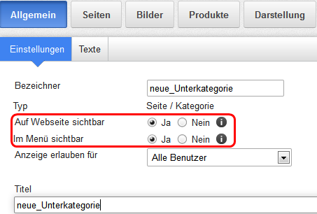 Anschließend klicken Sie auf den neuen Bezeichner und setzen diesen mit Ja auf sichtbar. Für Ihre Unterkategorie können Sie über die jeweiligen Reiter weitere Einstellungen vornehmen.