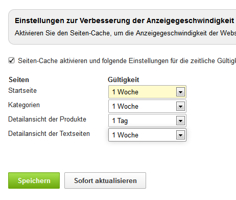 Wird der Verfügbarkeitsstatus nicht richtig bzw. nicht immer aktuell angezeigt, liegt das eventuell an der Funktion zur Optimierung der Antwortzeiten im Shop. In Ihrer Shopadministration haben Sie die Möglichkeit unter dem Menüpunkt Einstellungen -> Allgemeine Einstellungen -> Seiten-Cache die Parameter für die Aktualisierungsdauer, im Webshop Gültigkeit genannt, zu ändern.