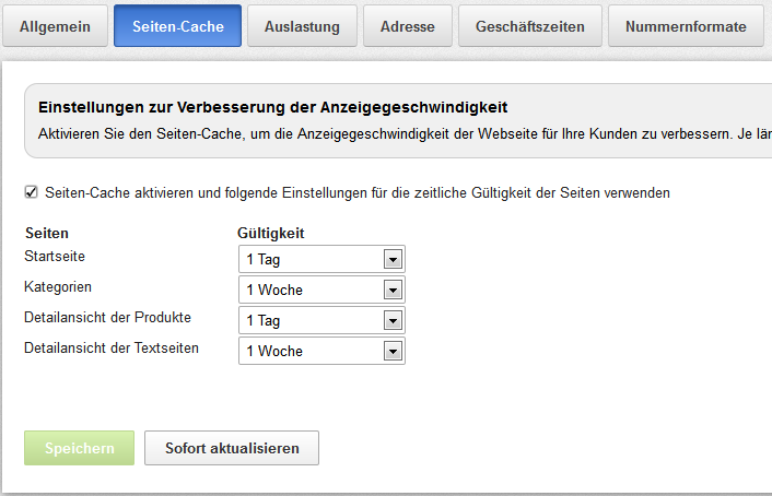 Seiten-Cache die Parameter für die Aktualisierungsdauer, im Webshop Gültigkeit genannt, zu ändern.