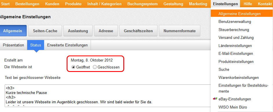 Klicken Sie dazu im Administratorbereich in der oberen Menüleiste auf Einstellungen und auf das Untermenüfeld Allgemeine Einstellungen. Auf der folgenden Seite klicken Sie bitte auf Allgemein und danach auf Status.