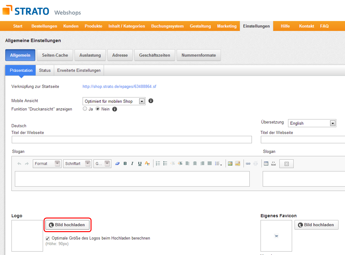Das Favicon Ihres Webshops können Sie an derselben Stelle hinterlegen, wie Ihr Logo: im Menü unter Einstellungen -> Allgemeine Einstellungen – Schaltfläche Allgemein, Reiter Präsentation
